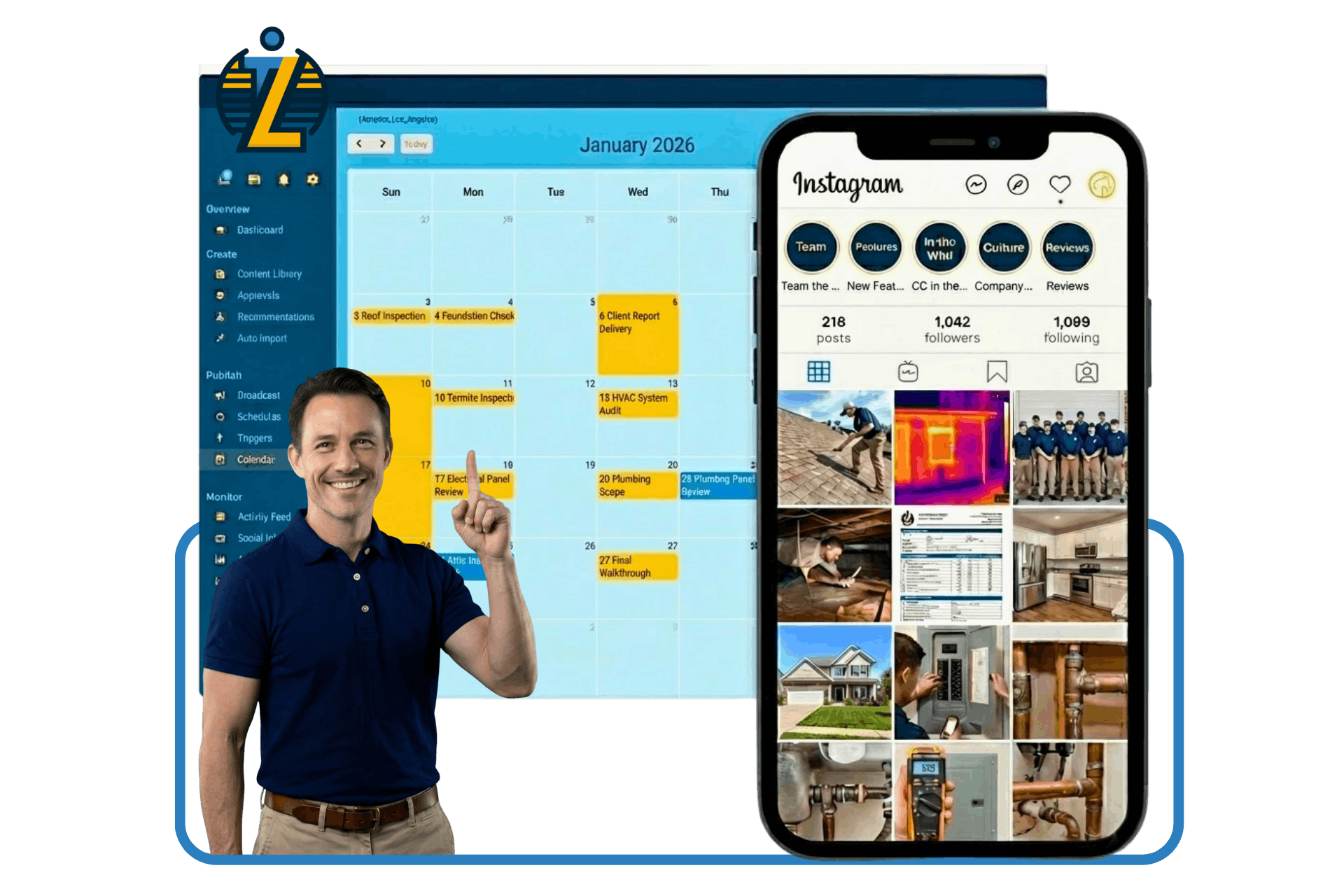 Social media shouldn’t eat your day or profits. Our system streamlines content, scheduling, and multi-channel posting so you focus on inspections, not social media.